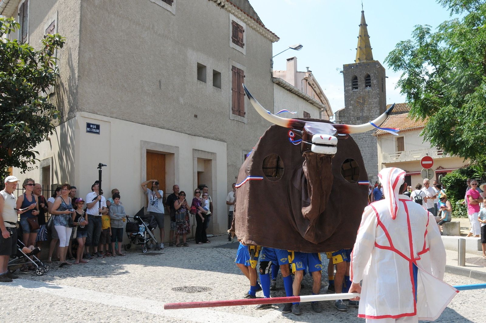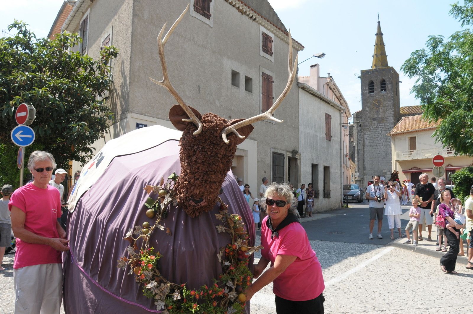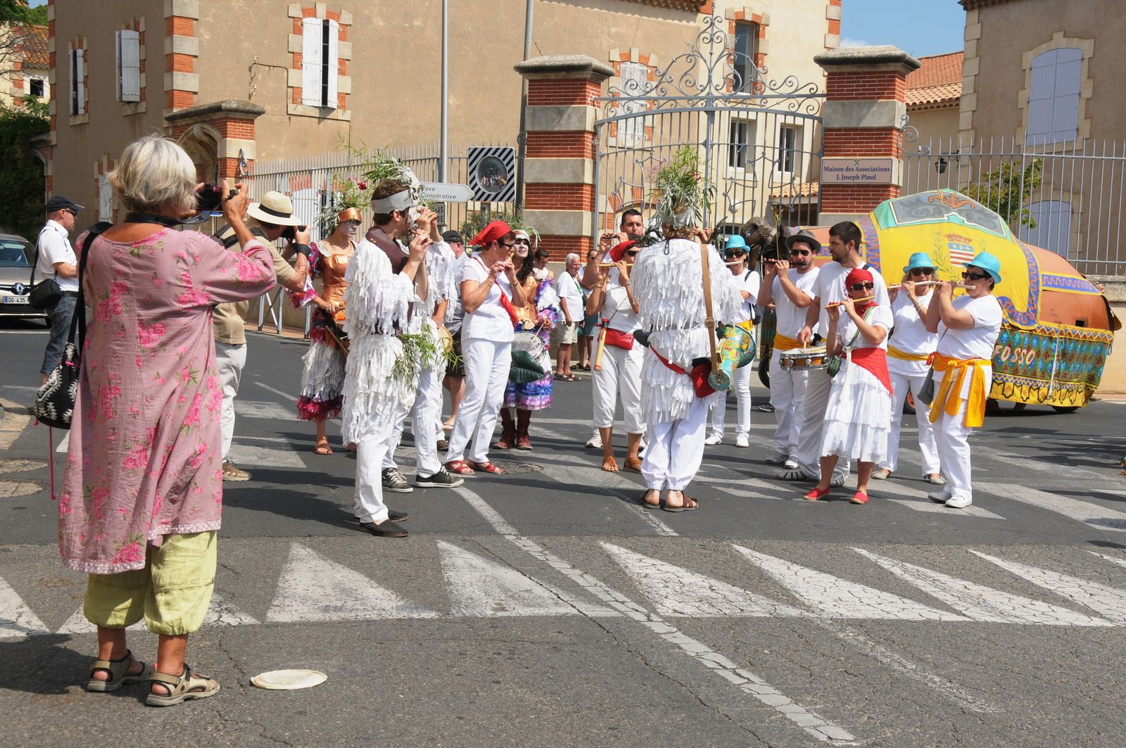 Départ du défilé par le boulevard F.Mistral , l'église, la mairie et une belle présentation place de l'Abrivado pour terminer au bord du Canal du Midi..