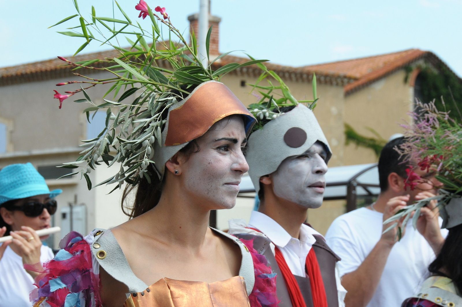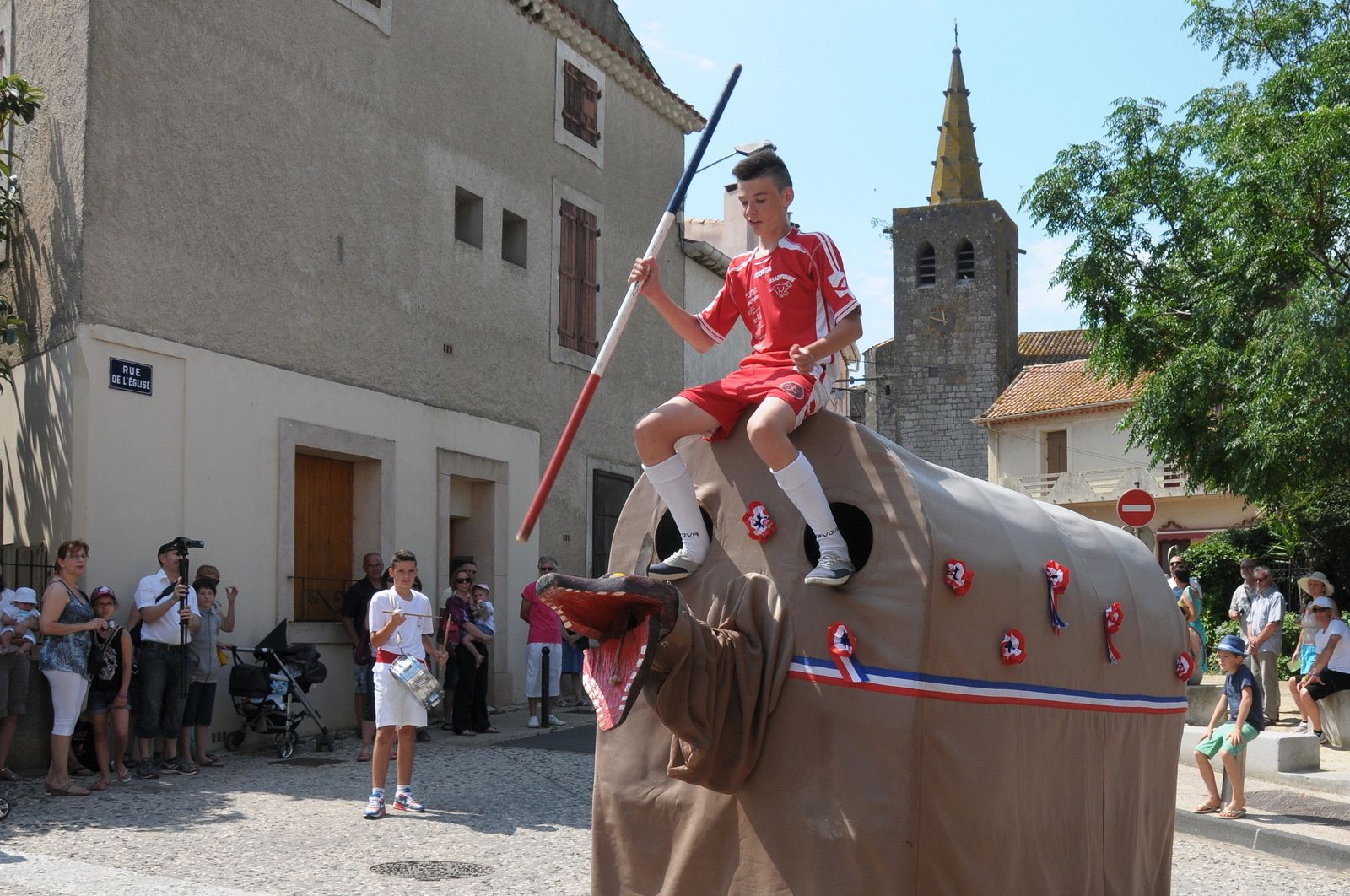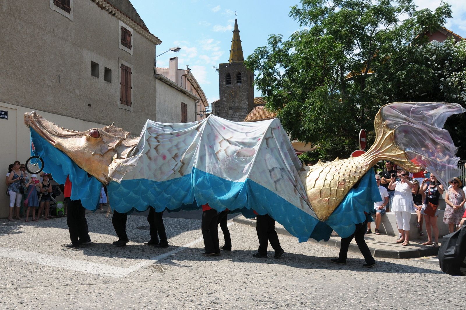 Départ du défilé par le boulevard F.Mistral , l'église, la mairie et une belle présentation place de l'Abrivado pour terminer au bord du Canal du Midi..